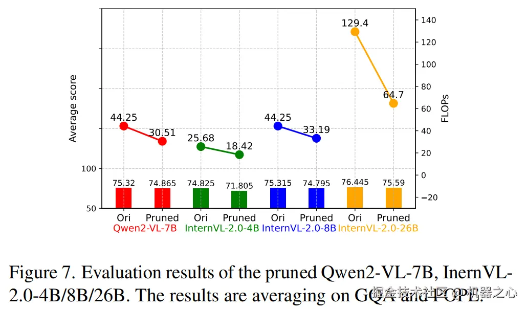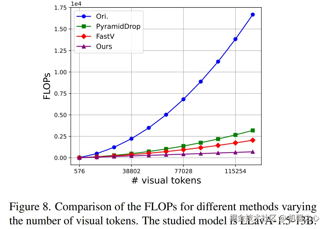 在应用了此剪枝方案后,模型的计算复杂度由和视觉 token 数量的二次方成正比降为了和其数量成正比。