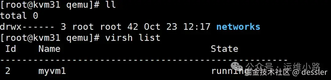 主机处于运行状态,但是在默认的目录里面是没有该主机xml文件,它处于/run/libvirt/qemu目录,这个目录我们之前讲tmpfs虚拟文件系统说过它是基于内存的,如果这个时候我把这个主机关机,则这个主机在目标主机就会消失。