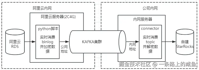 3.在这台阿里云服务器上面部署数据实时同步的脚步,一边实时读取RDS的binlog,将其解析加密之后发送到KAFKA中。