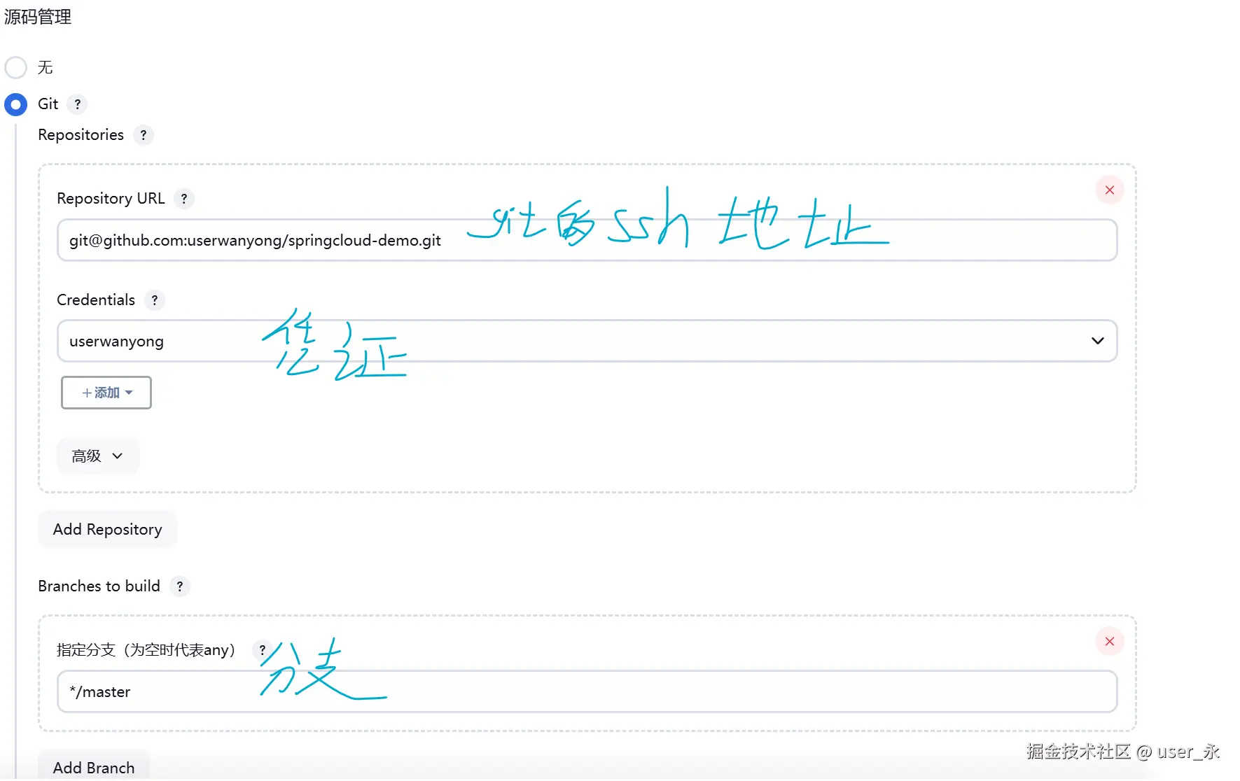 凭证是上面添加的github的ssh凭证(密码方式已弃用)