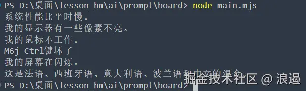 for...of循环遍历这个数组。对于数组中的每一个元素issue,构造一个新的提示resultPrompt,要求将该语句翻译为中文,接着调用getComleteion函数获取翻译结果并打印出来。 - 之后,构造一个提示