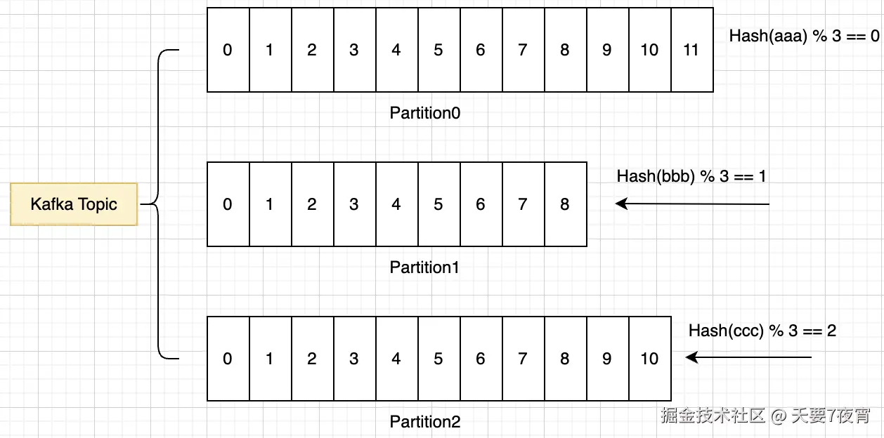 - 如果没有指定Partition,但是指定了一个Key,那么就是根据Key的Hash对Partition数目取模来决定是哪个Partition,也就是说只要发送时指定了相同的Key,那么相关消息一定会发送到相同的Partition,比如图中我们假设Key是bbb时,Hash取模算出来是1,那么就写入对应的Partition1,如果每条数据都指定Key是bbb,那么这些数据都会流入Partition1;