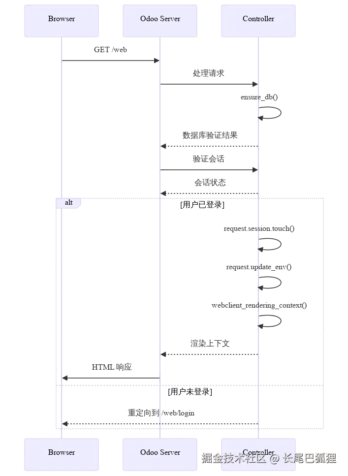 浏览器通过 HTTP 请求访问 Odoo URL(例如 /web)。后端使用路由解析请求,验证会话状态,并生成 HTML 响应。