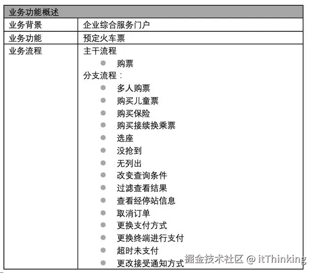- 第一部分:业务功能概述,业务功能通过主干流程和分支流程实现,要点是“1个主干 N个分支”方式的流程分解