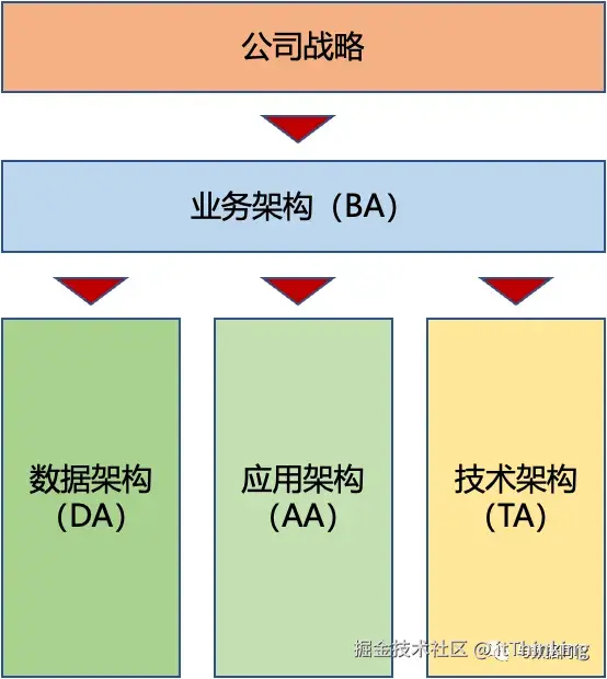 企业架构包含了四部分,BA(Business Architecture,业务架构)、DA(Data Architecture,数据架构)、AA(Applications Architecture,应用架构)、TA(Technology Architecture,技术架构)。