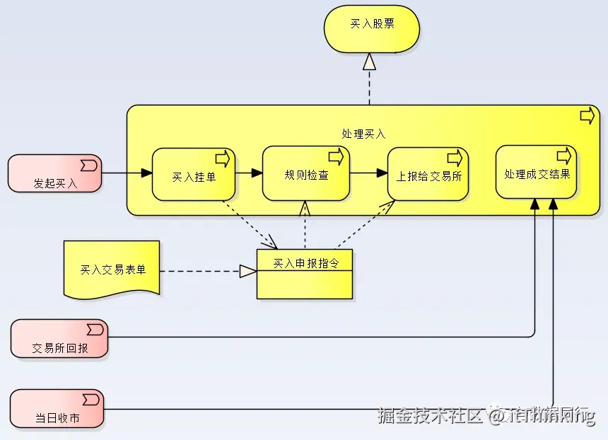 3)业务事件——图中“交易所回报”事件会触发券商“处理成交结果”,当收市时,“当日收市”事件也会触发相应业务处理。可见,用好业务事件,有利于把“条件触发的业务场景”表达清楚。