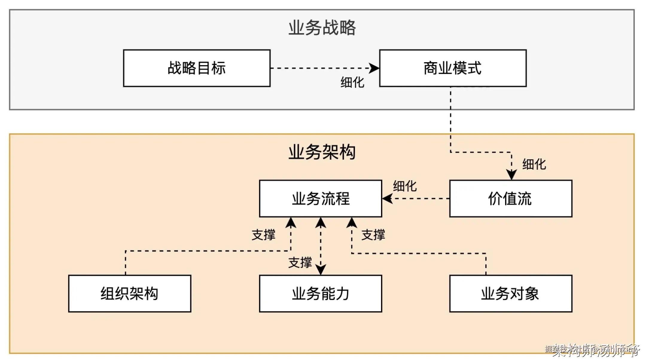 公司管理层提出业务战略之后,业务架构师设计业务架构,在业务架构的基础上发展出了数据架构、应用架构、技术架构。