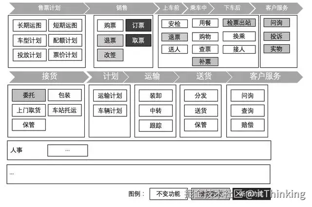 有了价值流,下一步就针对价值流每个节点,分析出要具备哪些业务功能来支持节点。比如运输服务公司价值流中,每个节点进行了业务功能分解。