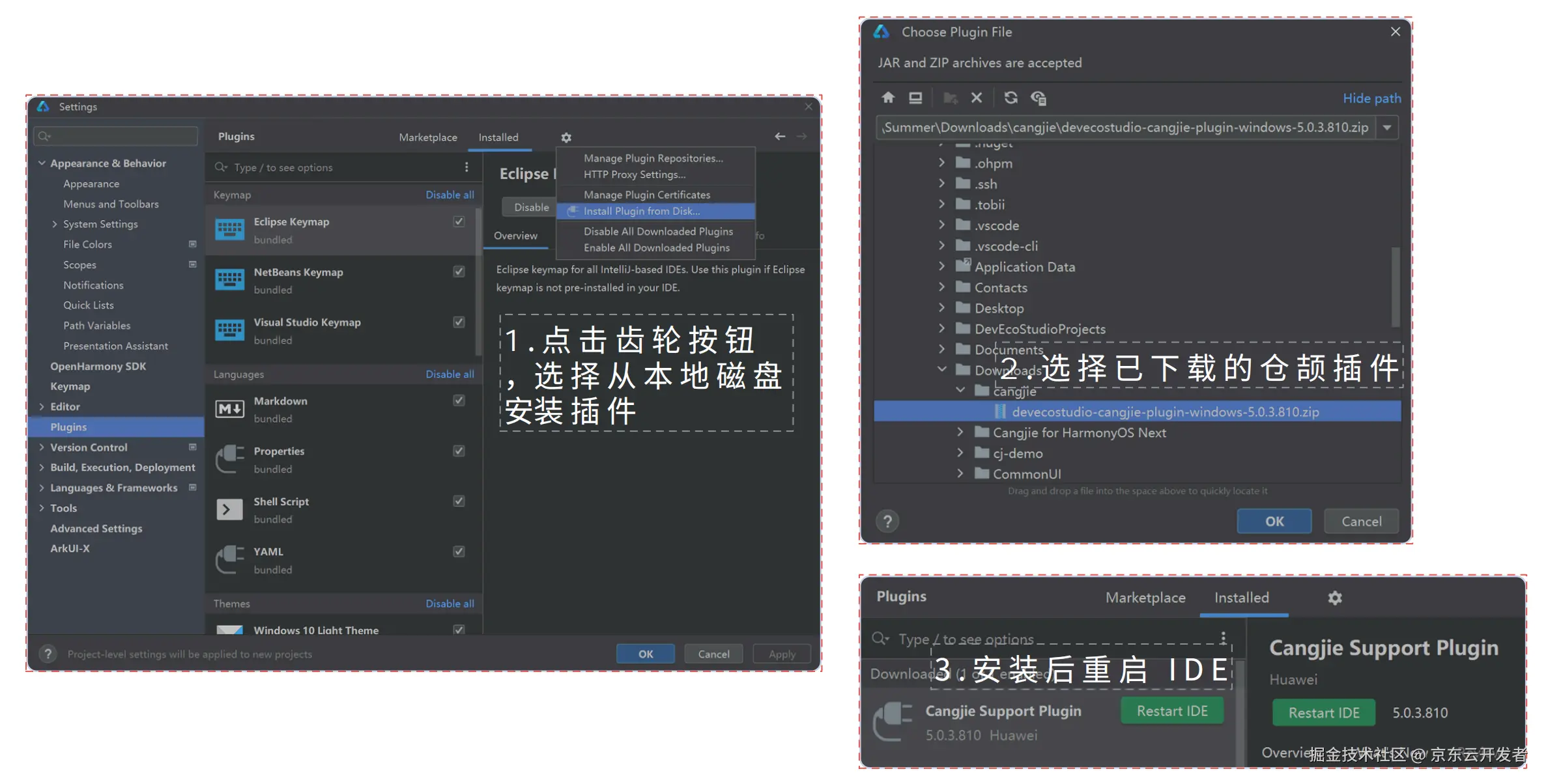 打开DevEco Studio,进入设置,在plugin标签下选择从本地磁盘安装插件,安装后重启IDE。