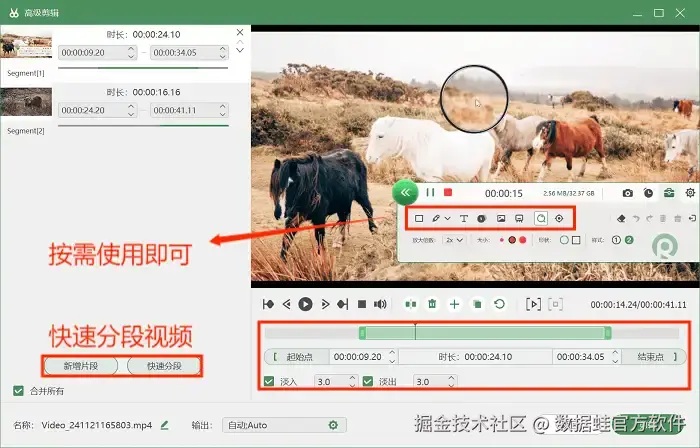 步骤3: 在录制的过程中,我们还可以使用软件自带的标注工具对录制的直播片段进行标注。录制结束后,可以在 “高级剪辑” 页面中快速分段视频、剪辑需要的视频片段等。