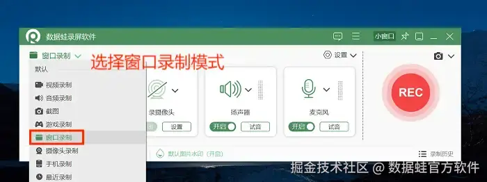 步骤1: 直播怎么录屏?点击进入软件后,首先需要在主页面的左上角选择合适的录制模式。本文以 “窗口录制” 为例。