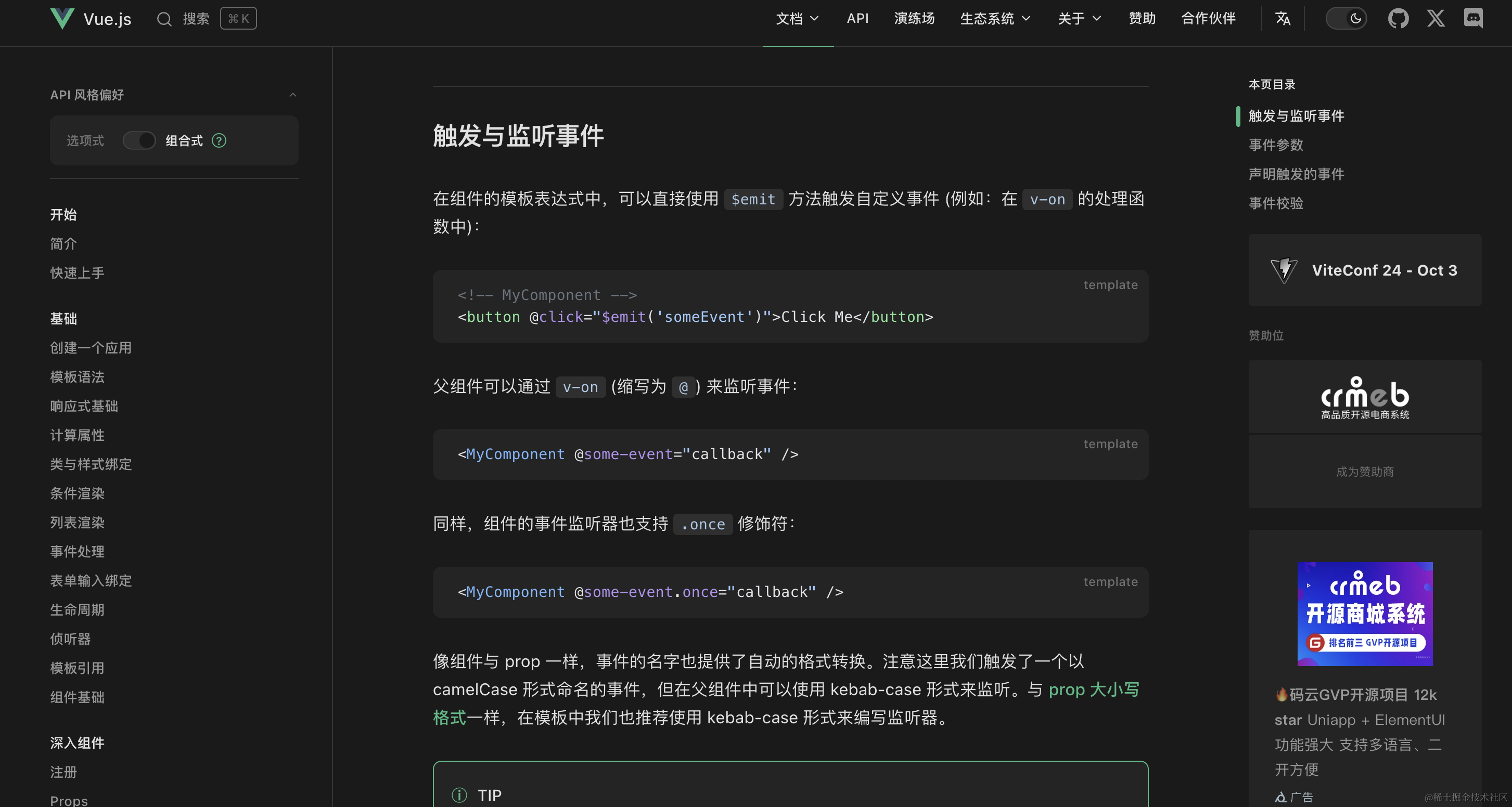 如果一个原生事件的名字 (例如 click) 被定义在 emits 选项中,则监听器只会监听组件触发的 click 事件而不会再响应原生的 click 事件。