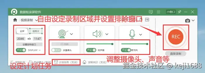 步骤2:在视频录制中,可以自由设定录制的屏幕区域,并根据需要对摄像头和声音进行调整。即时录制只需要点击 【REC】 进行录屏即可。也可以进入 【计划任务】 中对直播录制任务进行设定,如此可为您节省时间也不会错过屏幕上的精彩内容。