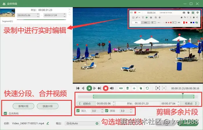 步骤3:在录制过程中,我们可以使用工具箱里的工具对视频进行实时的编辑。录制结束后也可以进入 【高级剪辑】 页面对视频进行剪辑、增加特效等操作。