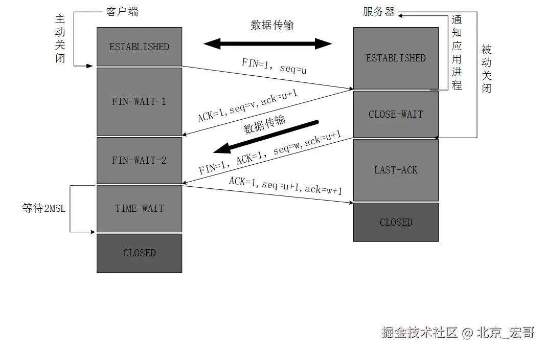 数据传输完毕后,双方都可释放连接。最开始的时候,客户端和服务器都是处于ESTABLISHED状态,然后客户端主动关闭,服务器被动关闭。