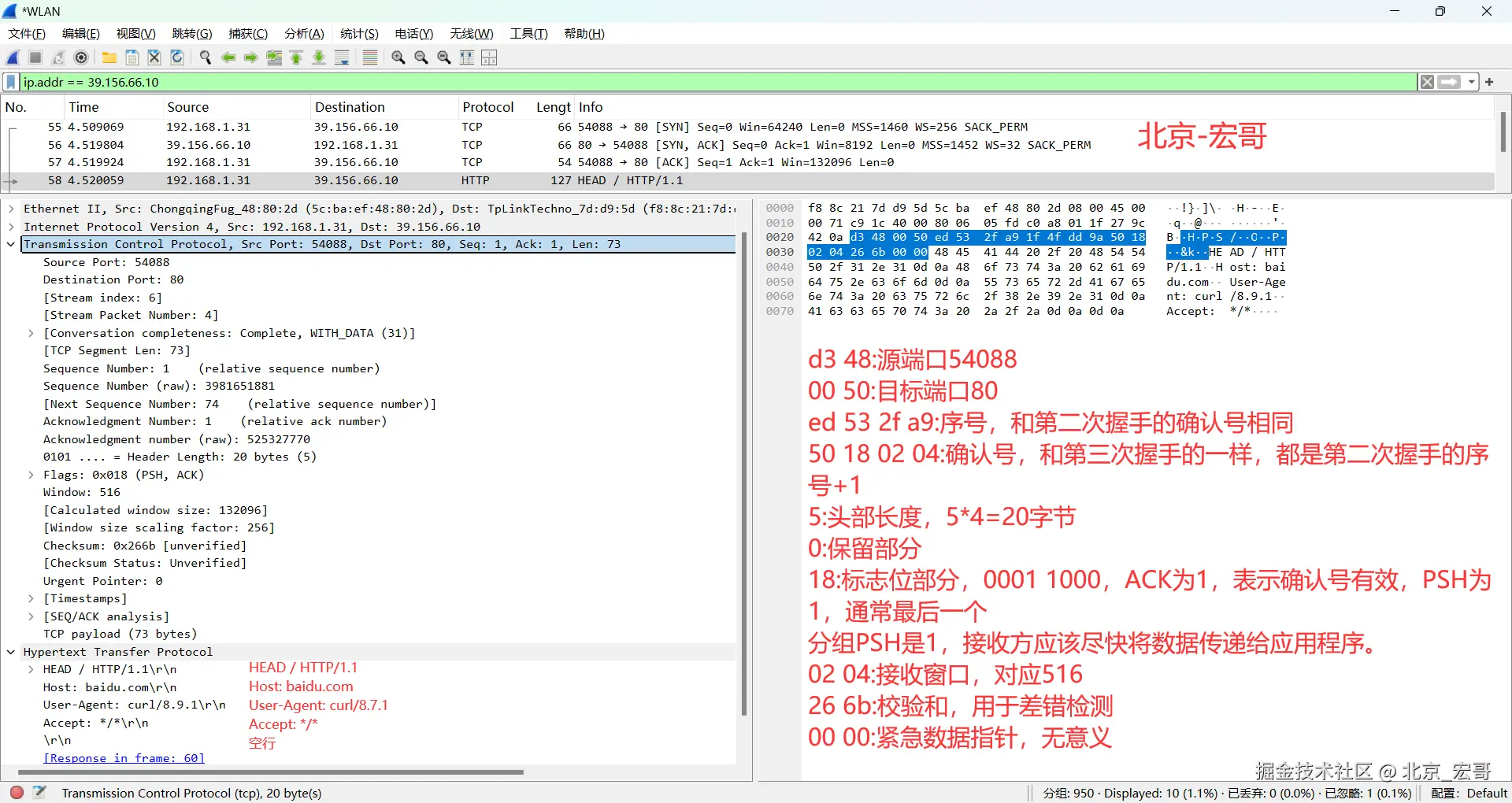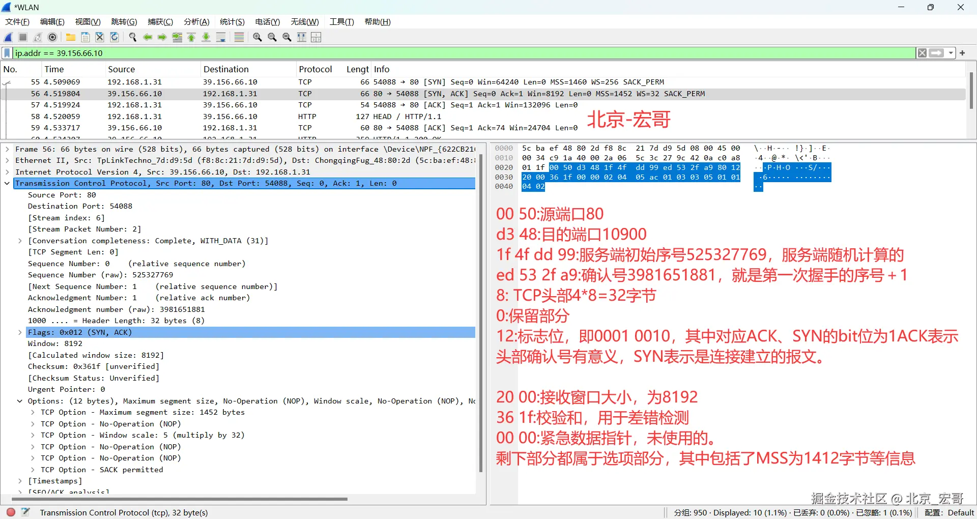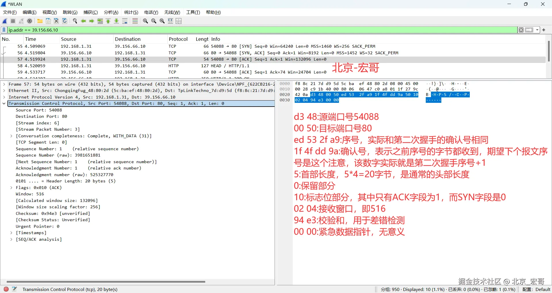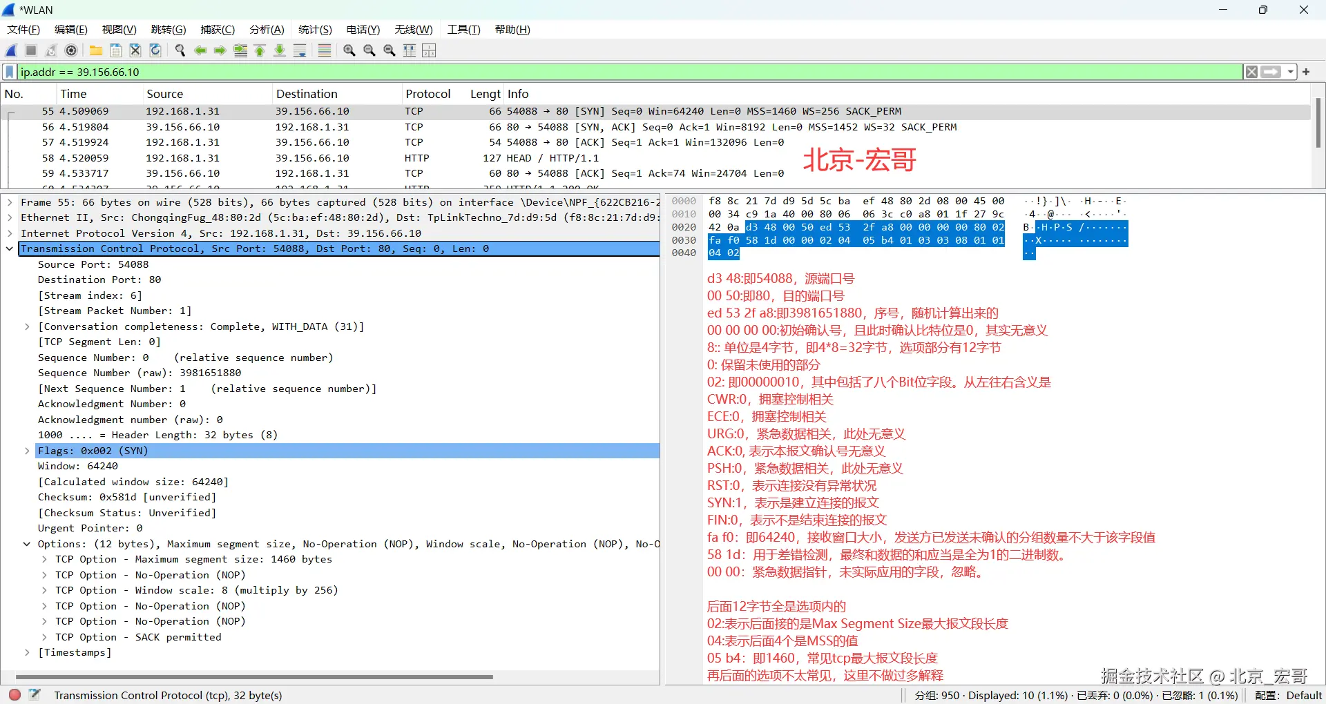 2.从上图可以看出其中39.156.66.10就是度娘的IP地址,后面需要通过这个IP地址,作为wireshark的过滤条件,方便我们找到对应的报文。
