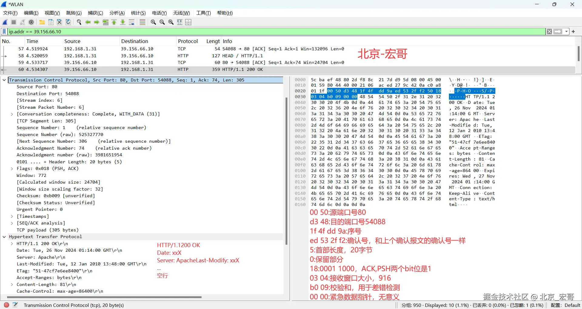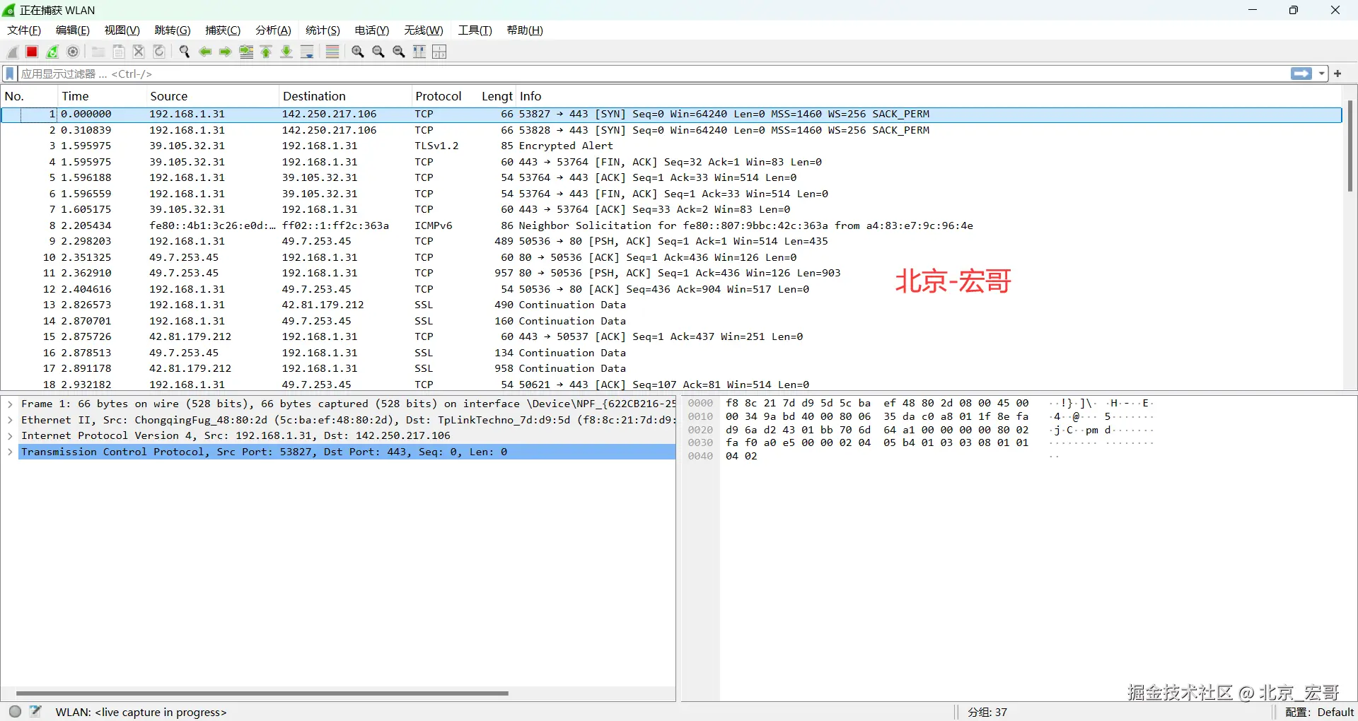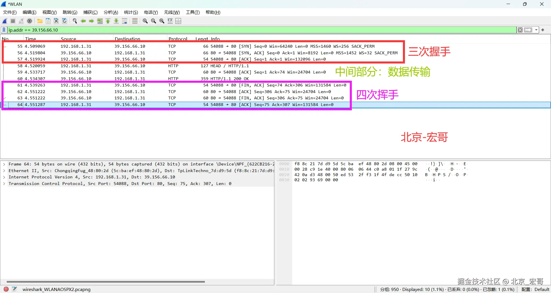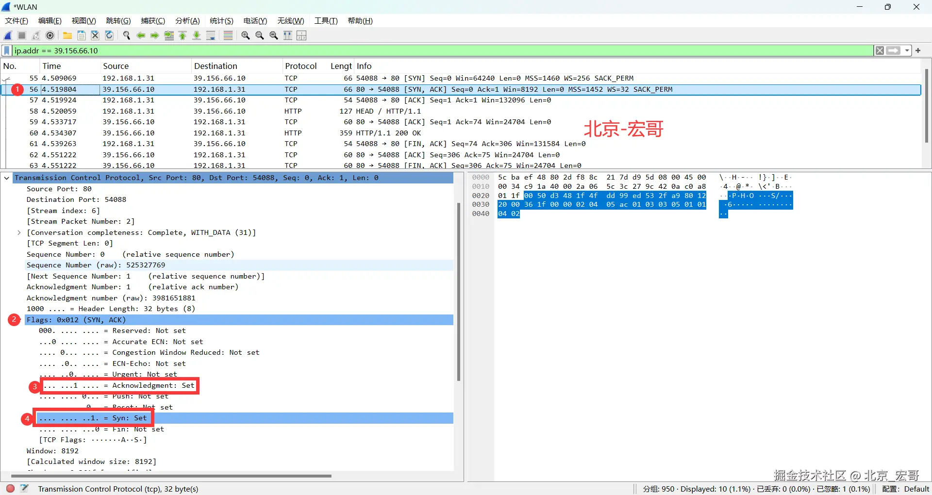2.从上图可以看出其中39.156.66.10就是度娘的IP地址,后面需要通过这个IP地址,作为wireshark的过滤条件,方便我们找到对应的报文。