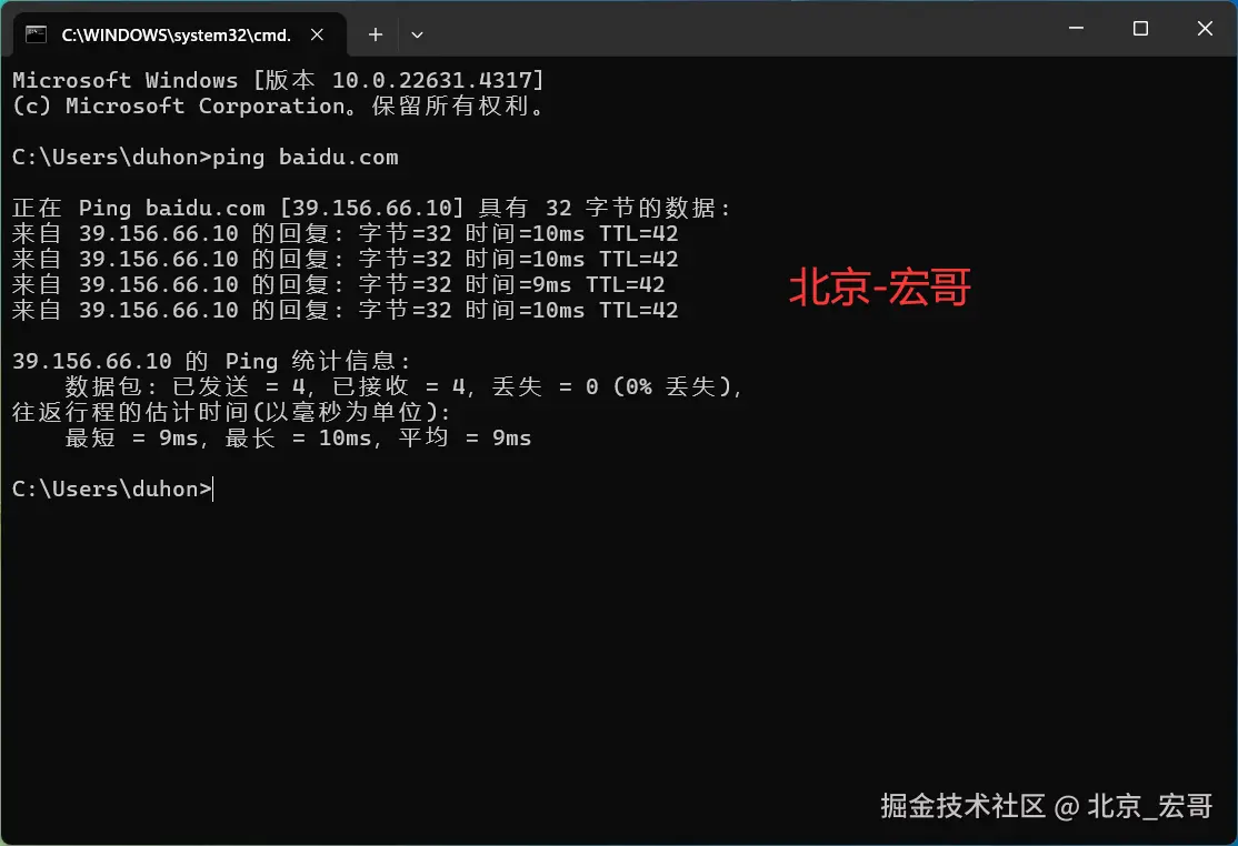 1.首先我们来先看一下百度的IP是多少,想必都知道如何获取吧!方法很多,宏哥就要其中一种最简单的方法来看一下:通过ping命令即可:ping baidu.com,如下图所示: