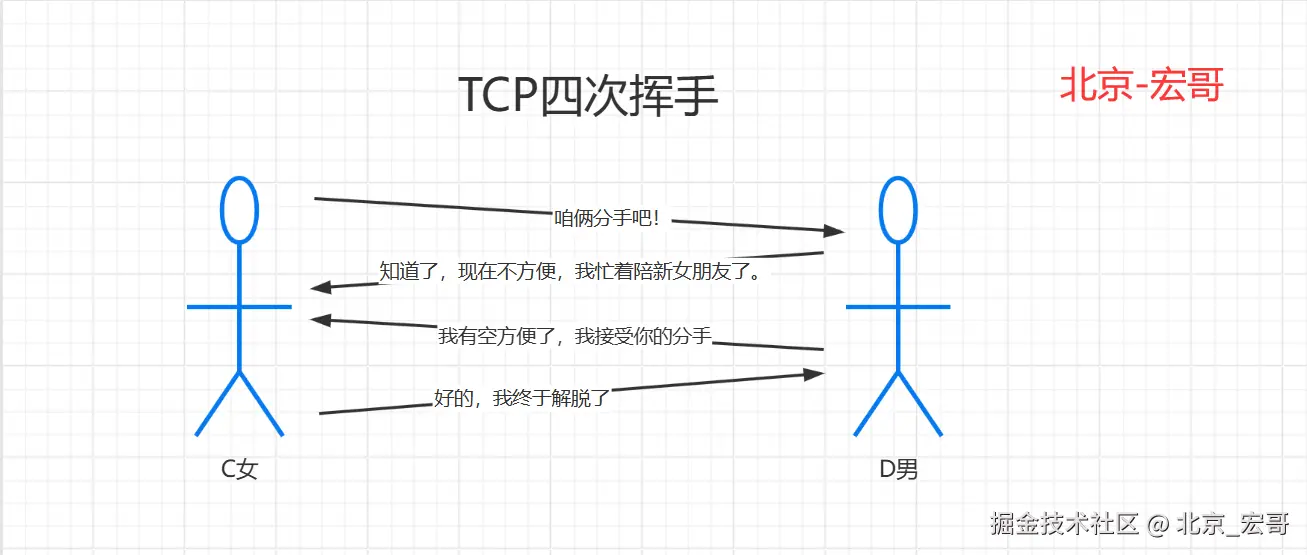 4)C收到D的回复后,告诉D我终于解脱(第四次挥手)。