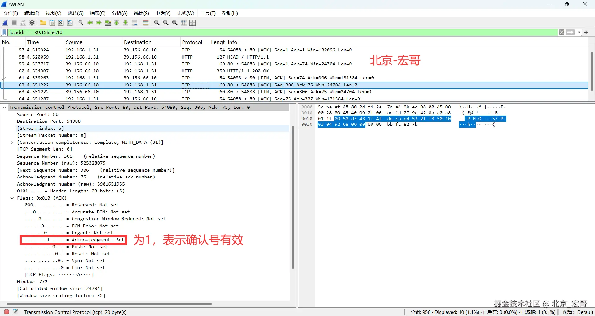 1.同样的方法:点击选中HTTP请求后TCP的确认报文即可查看。如下图所示: