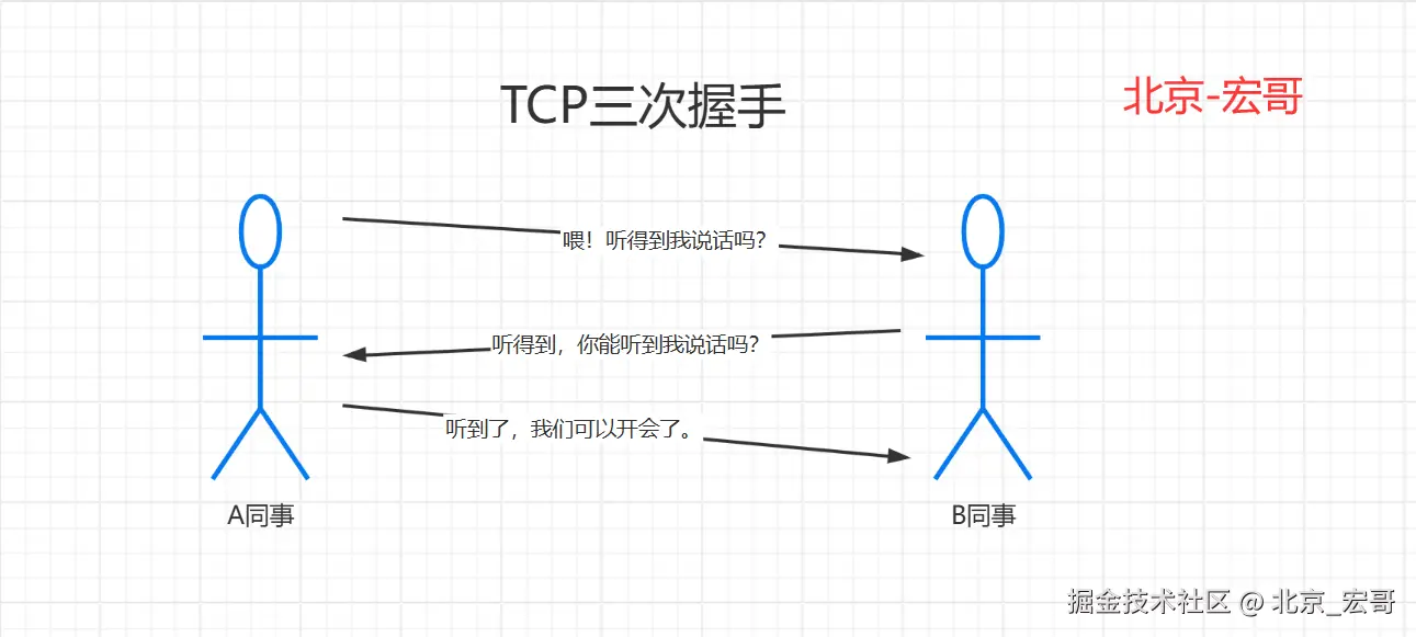 3)A同事:听到了,我们可以开会了(第三次握手A-->B)。