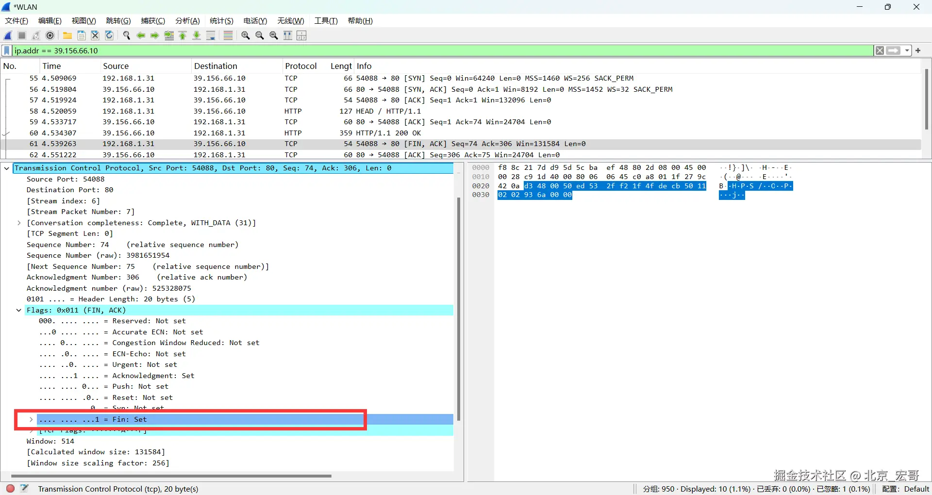 HTTP响应对应的TCP确认报文,实际上,这个也是第一次挥手的报文。第一次挥手和HTTP响应的确认报文是同一个报文,和其他的报文相比,除了FIN bit位被置为1,并没有什么其他区别。如下图所示: