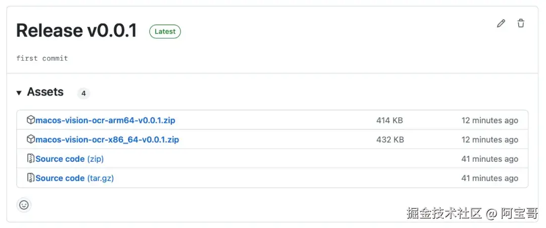 目前 macos-vision-ocr 的版本是 0.0.1,可以在 macos-vision-ocr/releases 页面下载: