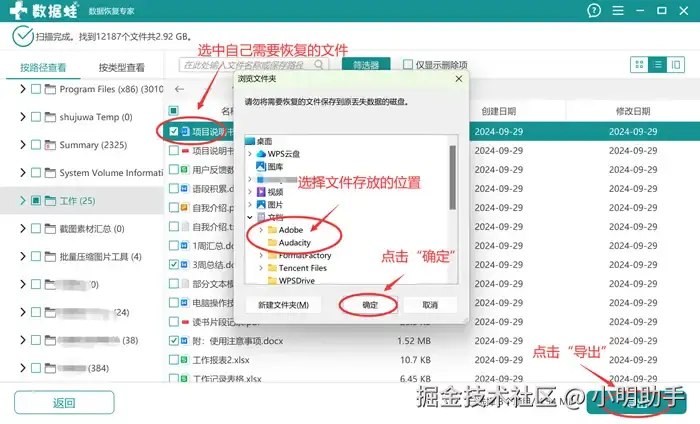 第2步: 在扫描出来的众多数据中选择自己需要恢复的文件,点击“导出”;再为目标文件选择新的存储位置,最后单击“确定”。