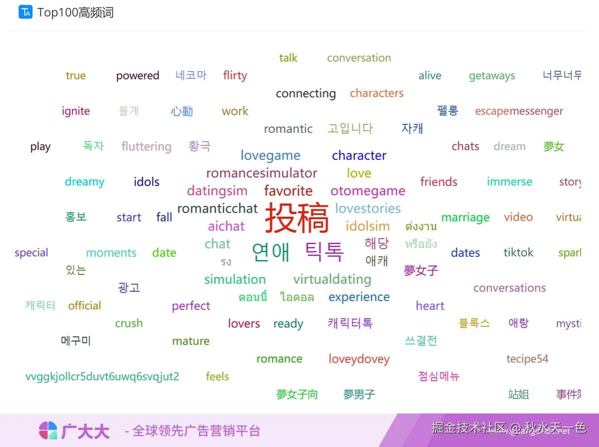 根据广大大-广告主分析-文案分析,我们看到了该产品的TOP100高频词云,其中关键词“投稿”出现的次数最高,主要也是因为【LoveyDovey】目前在日区还有转发评论等获取果酱的活动,在果酱的刺激下,这类活动就成了【LoveyDovey】的主要推广方向之一,同样也对产品的爆红起到了不小的推动。