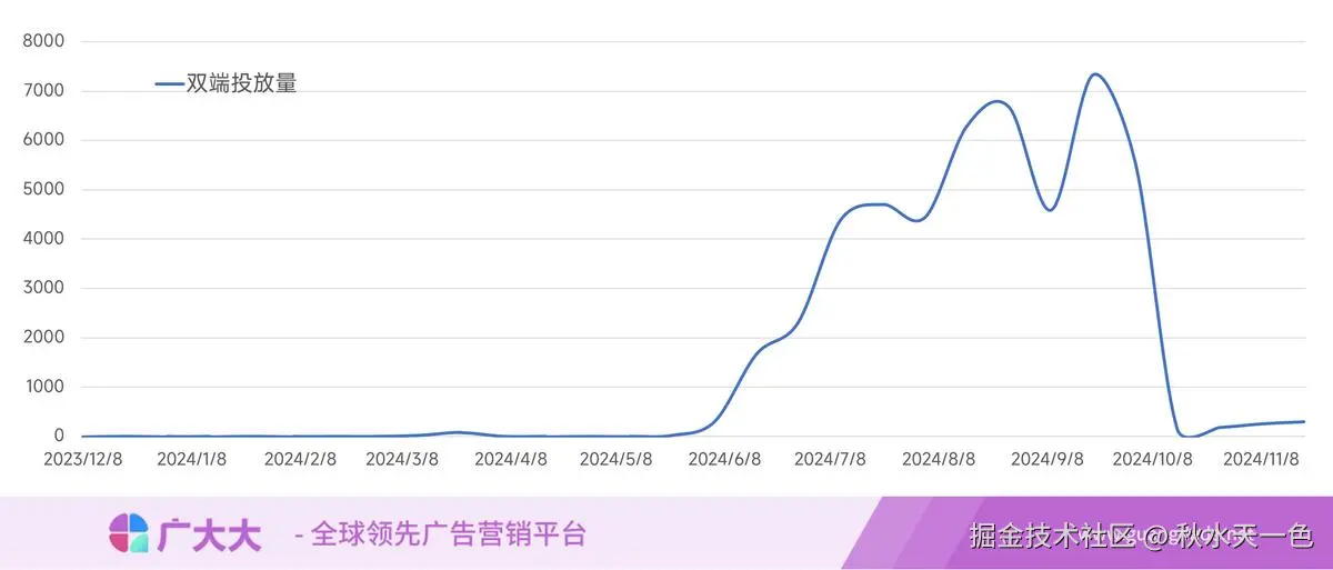 该产品虽然是2023年12月上架的,但在投放上来说一直都处于一种放养的态度,直到2024年的3月份才开始在韩国地区投放了少量素材,去重后创意数才堪堪过百。【LoveyDovey】的真正大推期是在2024年的8-9月份,双端周期内投放素材去重后合计超过7.4K,和其在小红书走红的时间非常接近,很难不怀疑背后没有官方的推动,所以我们可以基本确定,该产品的第一批种子用户就是通过其买量广告加上社交媒体的组合拳来进行转化的。