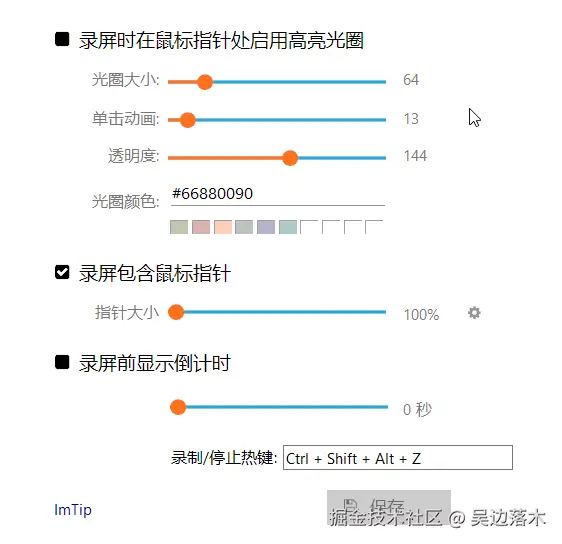 2. 还有一些关于这个软件的比较好用的小功能:鼠标指针是否需要光圈以及光圈设置;录屏是否包含鼠标指针;录屏前是否需要显示倒计时;以及一个录制/停止的快捷键功能