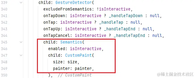 最后组件构建流程,点击事件通过 GestureDetector 监听;展示绘制使用 CustomPaint 组件: