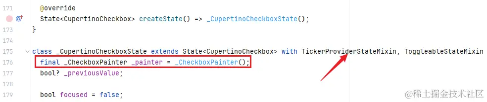 该组件依赖 _CupertinoCheckboxState 实现状态维护和视图构建的任务。状态类中混入了 TickerProviderStateMixin 说明需要进行动画处理。另外维护了 _CheckboxPainter 成员变量,用于绘制: