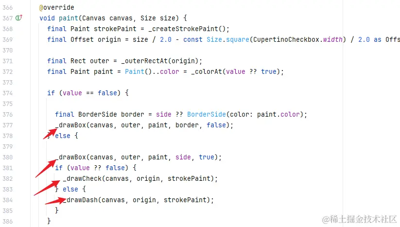 在 _CheckboxPainter#paint 方法中放置界面展示的绘制逻辑,包括边框和对钩。这个绘制相对比较简单,对绘制感兴趣的朋友可以自己看看,这里就不展开了。