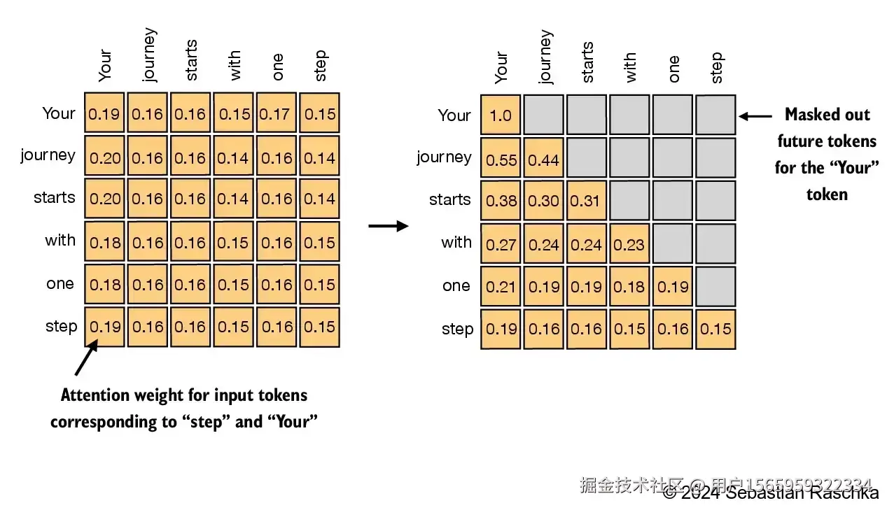 我们在计算出注意力得分后,对右上角元素都赋值为负无穷大,负无穷大在经过softmax后就变为了0。