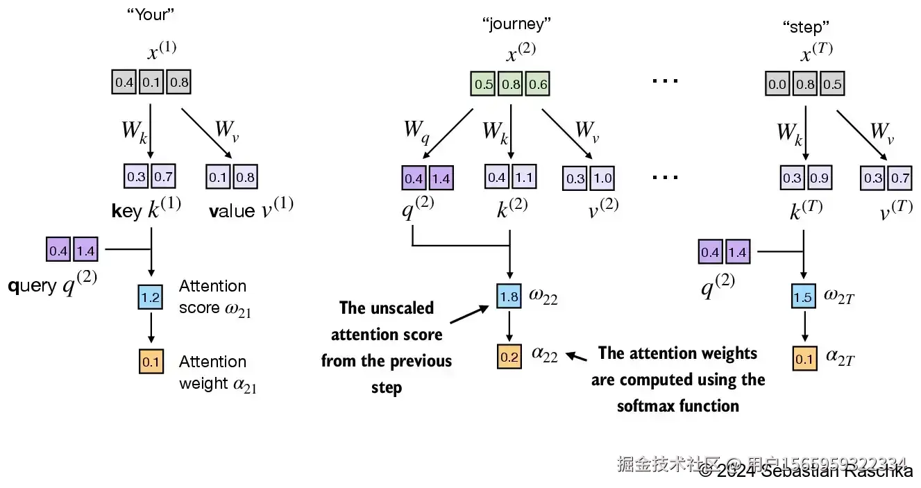 然后我们计算K和Q之间的点积,作为两两token之间的关联度。为什么要用两个不一样的矩阵,我的猜测是,如果使用的是一个矩阵计算相似度,那么关于对角线对称的元素就会完全相同,但是使用两个不同的矩阵计算,就不会存在这样的情况,可以学习到的内容更多。