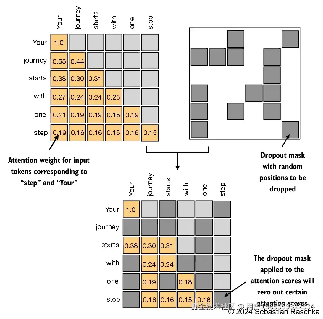 最后为了防止过拟合,一般会使用dropout,对注意力权重矩阵进行随机丢弃,加强模型泛化性能。