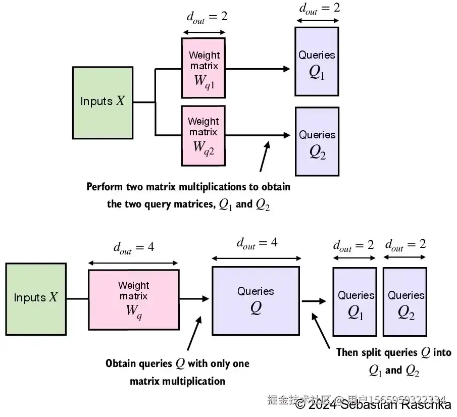 假设输入是(tokens, d_in),那么(tokens, d_in) @ (d_in, n*d_out) --> (tokens, n*d_out),输出的结果完美得到了n个头对应的输出,我们只需要按照每d_out列拆开,得到n个(tokens, d_out)的矩阵,就能还原出n个头对应的结果,进行后续的attention score计算。这样写起来虽然麻烦一些,但是效率更高。