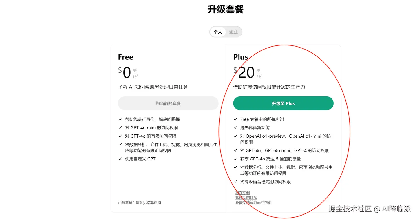 - 选择订阅计划 当前ChatGPT Plus的价格是20美元/月。确认这个计划后,点击“升级至plus”。