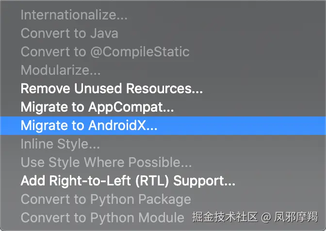 在 AndroidStudio 3.2 或更高版本(截图中 AndroidStudio 为 3.5 版本)中执行如下操作:菜单>Refactor > Migrate to AndroidX(如果迁移失败,就需要重复上面1,2,3,4步手动去修改迁移)