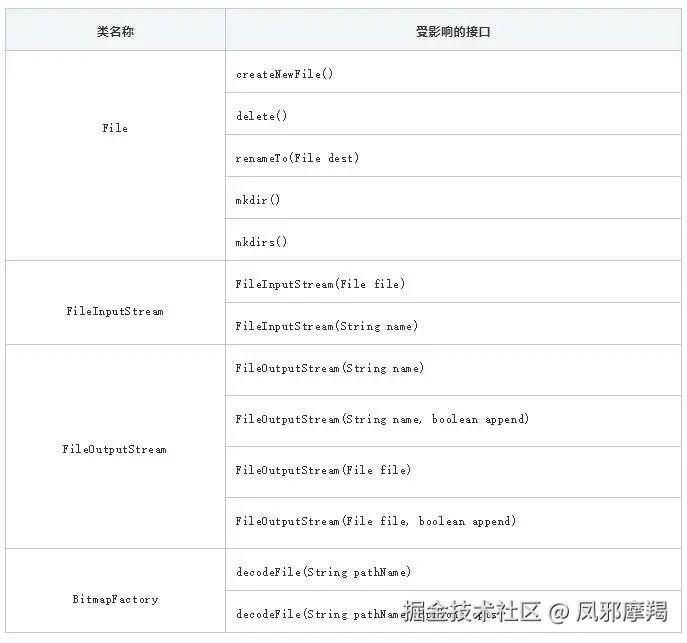 开启分区存储新特性, Andrioid 10不能够通过File Path路径直接访问共享目录下资源,以下接口通过File 路径操作文件资源,功能会受到影响,应用需要使用MediaStore或者SAF方式访问。