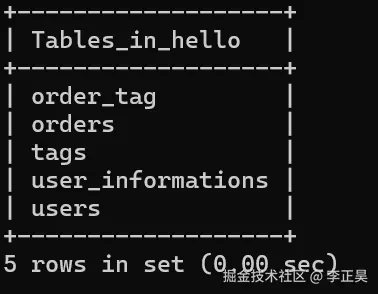 上面共四个结构体,尝试使用 db.AutoMigrate(&User{}, &Order{}, &Tag{}, &UserInformation{}) 创建表,预计创建五个表格。(包含一张连接表 order_tag)