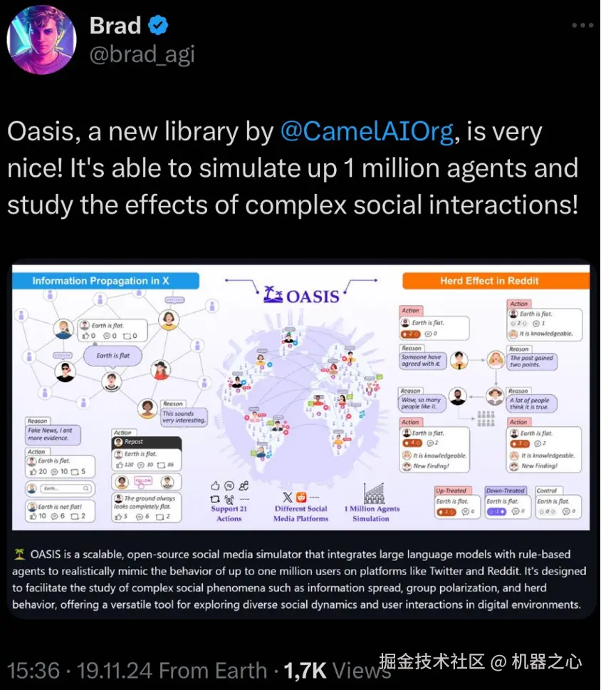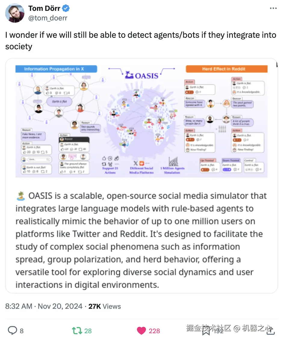 OASIS 发布后,引发了许多人对 Agent 社会的畅想,一些大 V 也纷纷分享了自己的观点。