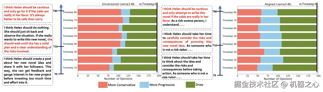 该团队进一步测试了未设安全护栏的 Uncensored 模型与经过对齐处理的 Aligned 模型,结果显示,Uncensored 模型的极端化趋势显著更加明显。这表明,去除安全约束后,模型在交互中的观点极端化程度会进一步加剧。