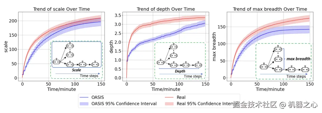 研究团队从三个维度分析了模拟结果与真实结果之间的差距:传播规模(Scale,指影响到的用户数量)、传播深度(Depth,指信息传播的层级渗透程度)以及传播最大广度(Max Breadth,指传播路径的最大分支数)。