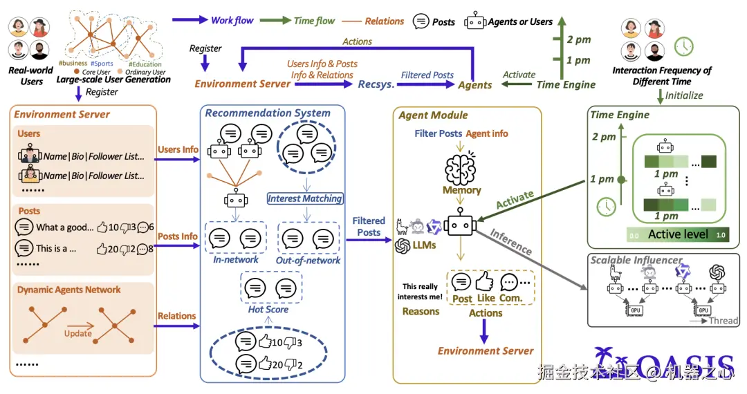 正是基于这一认识,OASIS 团队从社交媒体的视角出发,设计并搭建了这一平台,旨在充分利用社交媒体的优势,探索和实现智能体的大规模交互与协作。
