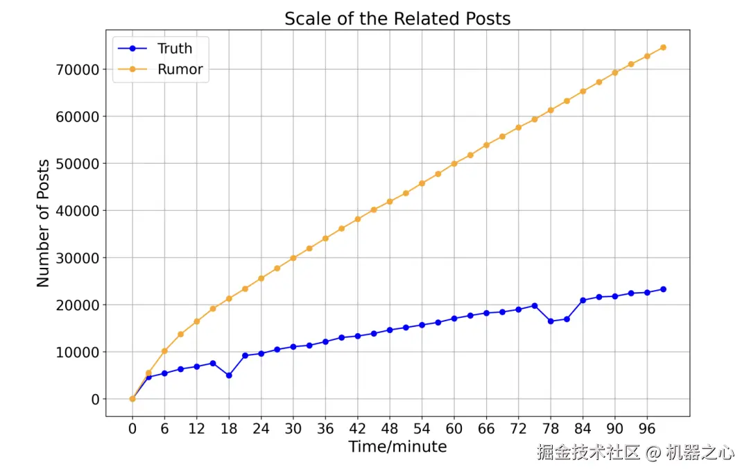 实验模拟了 96 分钟的交互过程,每 3 分钟为一个时间步。在此期间,该团队统计了真假消息相关帖子的数量变化,以分析真假消息的传播和影响力差异。
