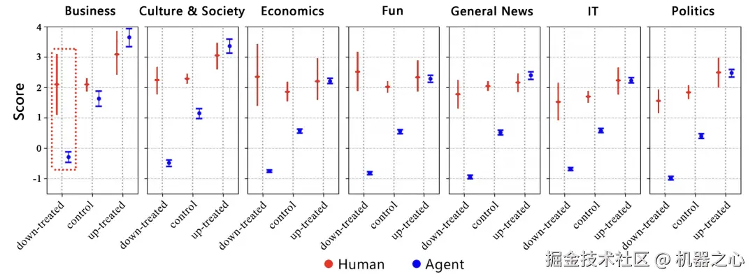 通过观察智能体在交互后各组帖子的最终得分变化,可以评估初始得分对用户行为的影响。实验结果(如下图所示)表明,初始「赞」显著提高了帖子最终得分,而初始 「踩」则对得分造成了抑制效果。这表明,用户在决策时受到群体行为的显著影响,进一步验证了羊群效应的存在。