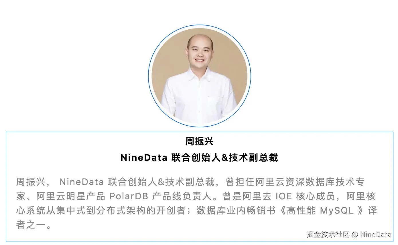 周振兴, NineData 联合创始人&技术副总裁,曾担任阿里云资深数据库技术专家、阿里云明星产品 PolarDB 产品线负责人。曾是阿里去 IOE 核心成员,阿里核心系统从集中式到分布式架构的开创者;数据库业内畅销书《高性能 MySQL 》译者之一。