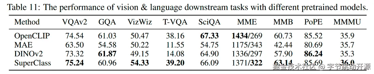 另外按照 LLaVA 的设置,使用 7B 的 LLM 评估了更多的多模态下游任务,同样 SuperClass 也取得了更好的精度。